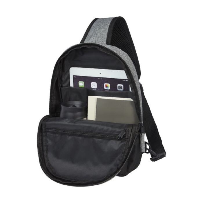 Promotional backpack with single strap and multiple pockets