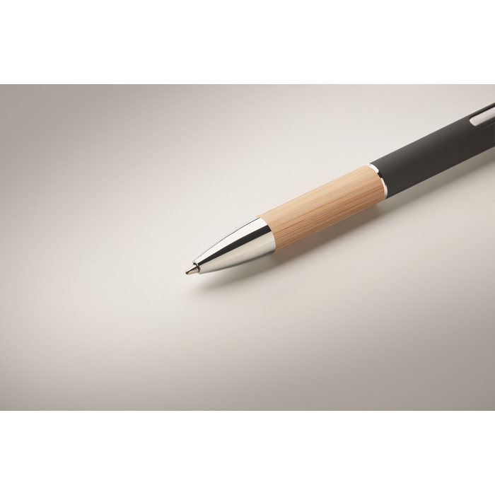 Ballpoint pen with push mechanism, bamboo handle, and blue ink
