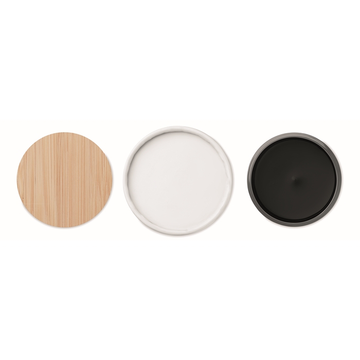 Vanilla-scented wax candle in a printed jar with bamboo lid